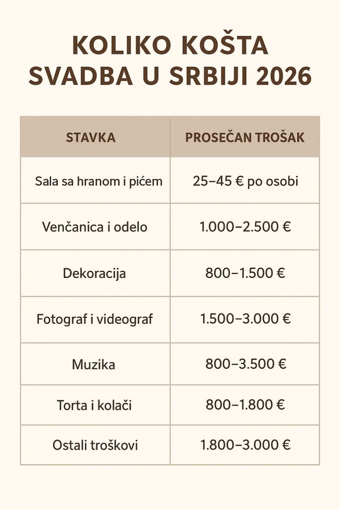 Da bismo vam olakšali planiranje, pripremili smo detaljan pregled prosečnih cena svadbi u Srbiji za 2026. godinu.